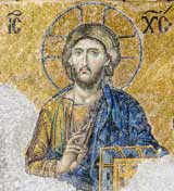 Christ holds in his left hand the Holy Scriptures (the Bible). Fingers position of his right hand shows that He is one of the Holy Trinity. Jesus is really God and really man.